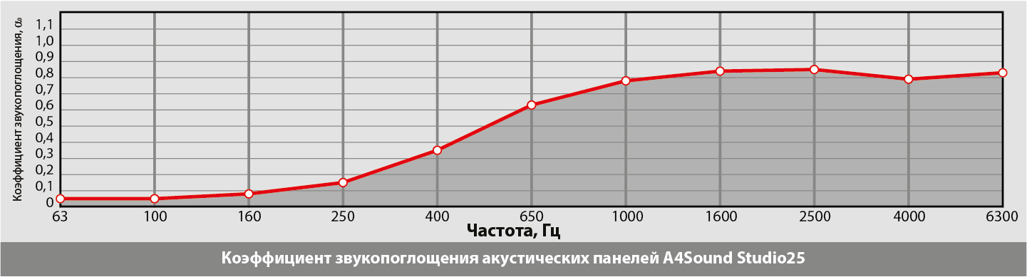 Акустичні панелі A4Sound Studio25 мають дуже високі показники звукопоглинання. Вони можуть монтуватися як декоративне рішення в інтер’єрі, а також всередині звукоізоляційних конструкцій.