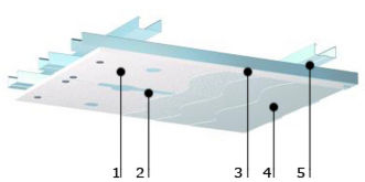 1. Акустическая панель 2. Акустическая шпаклевка 3. Клей для швов 4. Акустическое финишное покрытие 5. Подвесная систем |