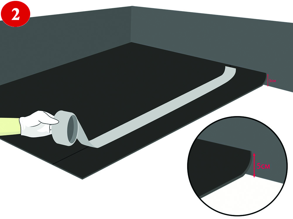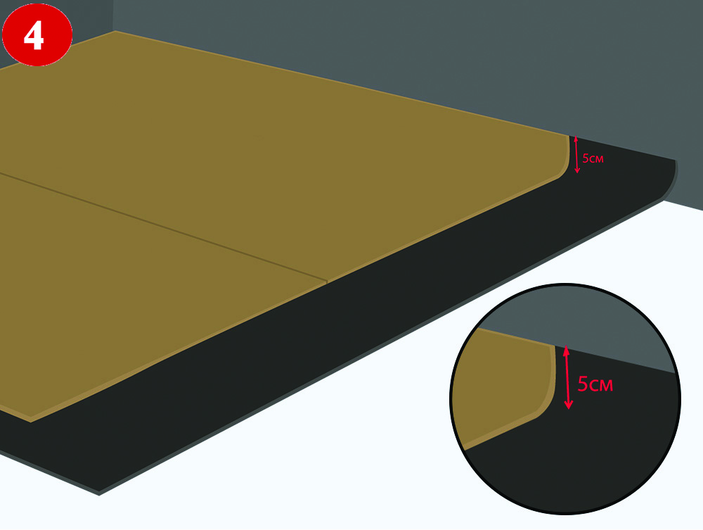 2. Проклейте стыки клеящей лентой для закрепления материала на поверхности. По периметру вспененный полиэтилен необходимо завести на 5 см. на стены.