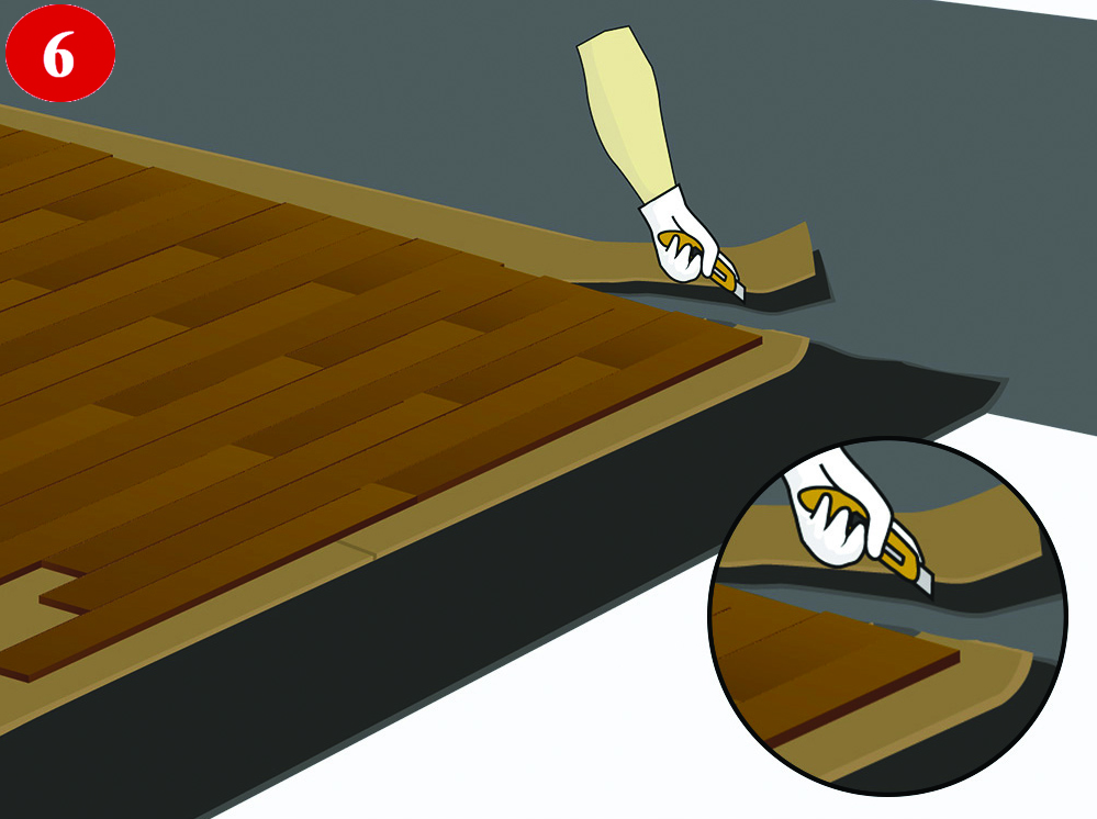5. После высыхания стяжки, отрежьте весь выступающий материал по периметру пола.