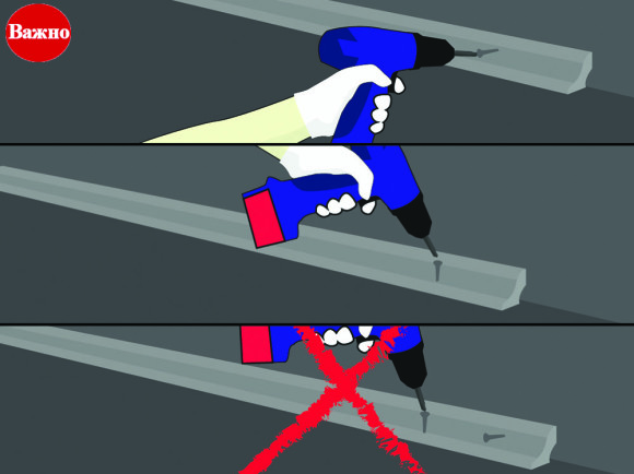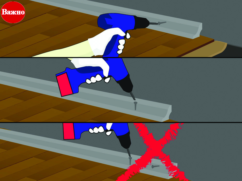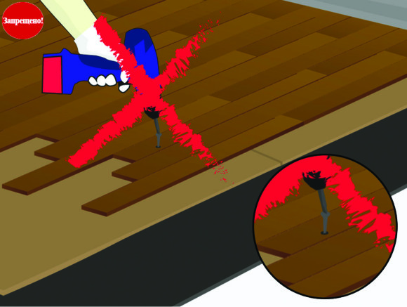 !!! Запрещено!!!: крепить напольное деревянное покрытие с помощью дюбелей, саморезов и других крепежей, которые повреждают звукоизоляционный напольный слой и соприкасаются с плитой перекрытия.