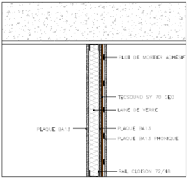 Розміщення листа на підставці: захисний силіконовий папір буде видалено, і лист буде розміщено на підставці, а потім притиснувши в усіх точках для гарного зчеплення. Різні секції виробу розташовуються впритул, слідкуючи за тим, щоб не було отворів, які могли б знизити рівень звукоізоляції, і їх можна закрити звукоізоляційною стрічкою Tecsound.®S50 Band 50. Повторюйте операцію, поки не буде покрита вся поверхня. Потім нанесіть на поверхню Tecsound кульки захоплюючої пасти.®SY GEO або на пластину, згідно з інструкціями виробника для системи прямого покриття, а потім пред’явіть пластину та натисніть для адгезії, регулюючи тиск, щоб вирівняти пластини одна з одною. Після цього шви між гіпсокартонними плитами герметизуються відповідно до інструкцій виробника.