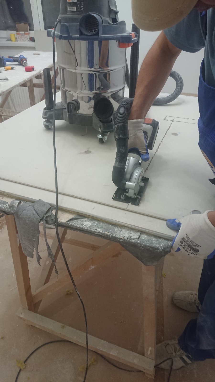 Ножом обрежьте выступающие края упругой прокладки по всему периметру примыкания звукоизоляционной системы к потолку, стенам и полу.